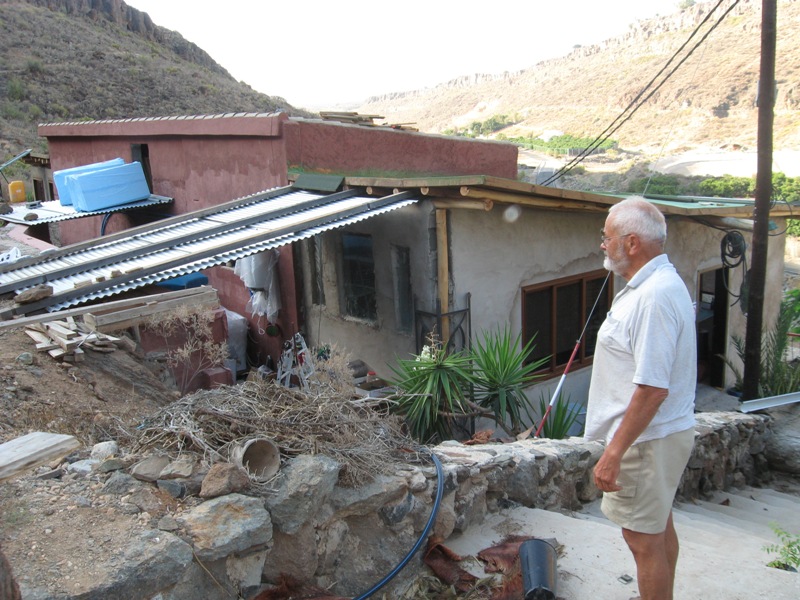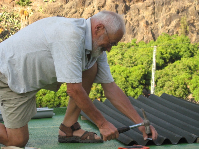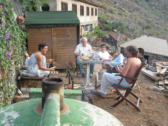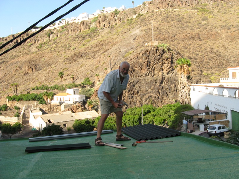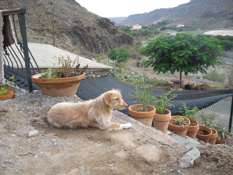 Hanna aus London und Najara aus Bilbao mit Negro, dem zugelaufenen Hund. Der hat sich an unseren Hühnern vergriffen. Darum ist er zu Maria gekommen. Maria, eine betagte Holländerin, ist seit vielen Jahren für alle Hunde zuständig vom dem Flughafen bis Mogan. Die sammelt sie ein in ihrem Garten. Über Internet findet sie Abnehmer in Holland und Deutschland. Zu diesem Zweck braucht sie laufend „Hundebegleiter“. Wer nimmt auf seinem Flug nach Mitteleuropa den Hund für die Meiers mit? Papiere sind alle fertig, Hund steht im Käfig am Flugplatz.
